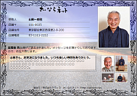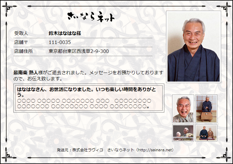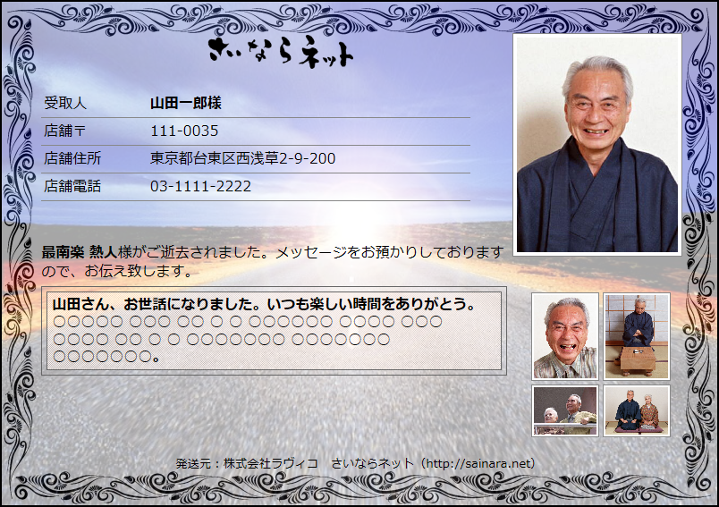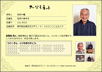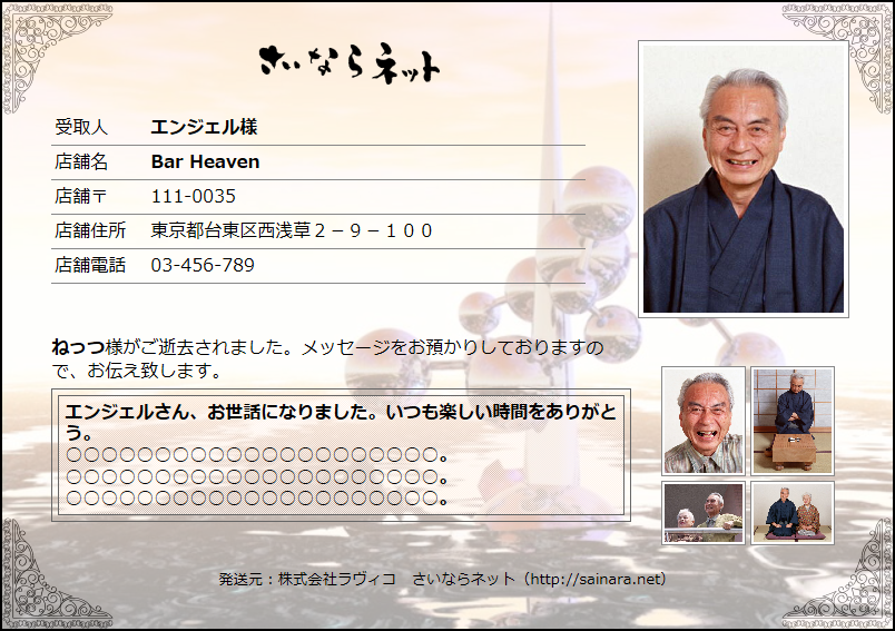 会員の方が亡くなられた場合、ご登録いただいていたあて先ごとのメッセージを、ご指定のメッセージカードに印刷して登録されているご住所に送付、あるいはメッセージカードを画像等にしてメールで送信致します。印刷物の送付かメール送信かはあて先ごとに選択が可能です。メッセージカードには、ご登録いただいた会員の方の写真やメッセージ等が記載されます。カードのデザインは、ご自分で選択が可能です。背景は100種類以上、フレームデザインは20種類以上ございます。